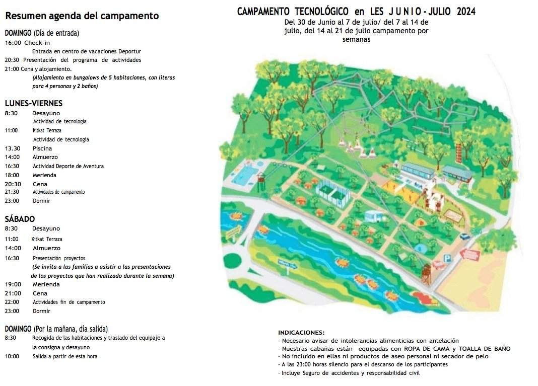 Mis hijos han venido encantados del campamento, dicen que ha sido una pasada. Vinieron maravillados de la experiencia, tanto de las instalaciones, del trato personal por parte de todo el equipo, de las actividades en el taller de robótica y ocio, como de la comida, …., vamos, que todo perfecto. Lo primero que dijeron al bajar del bus fue que el año que viene querían repetir.